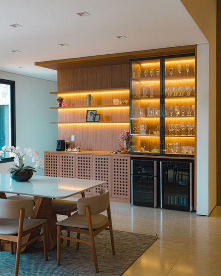Os tons amadeirados trazem aconchego e integração perfeita entre a Cozinha Gourmet, Sala de Jantar e Sala de TV, criando um ambiente sofisticado e acolhedor. Enquanto a iluminação em LED realça cada acabamento, trazendo personalidade e elegância ao espaço.